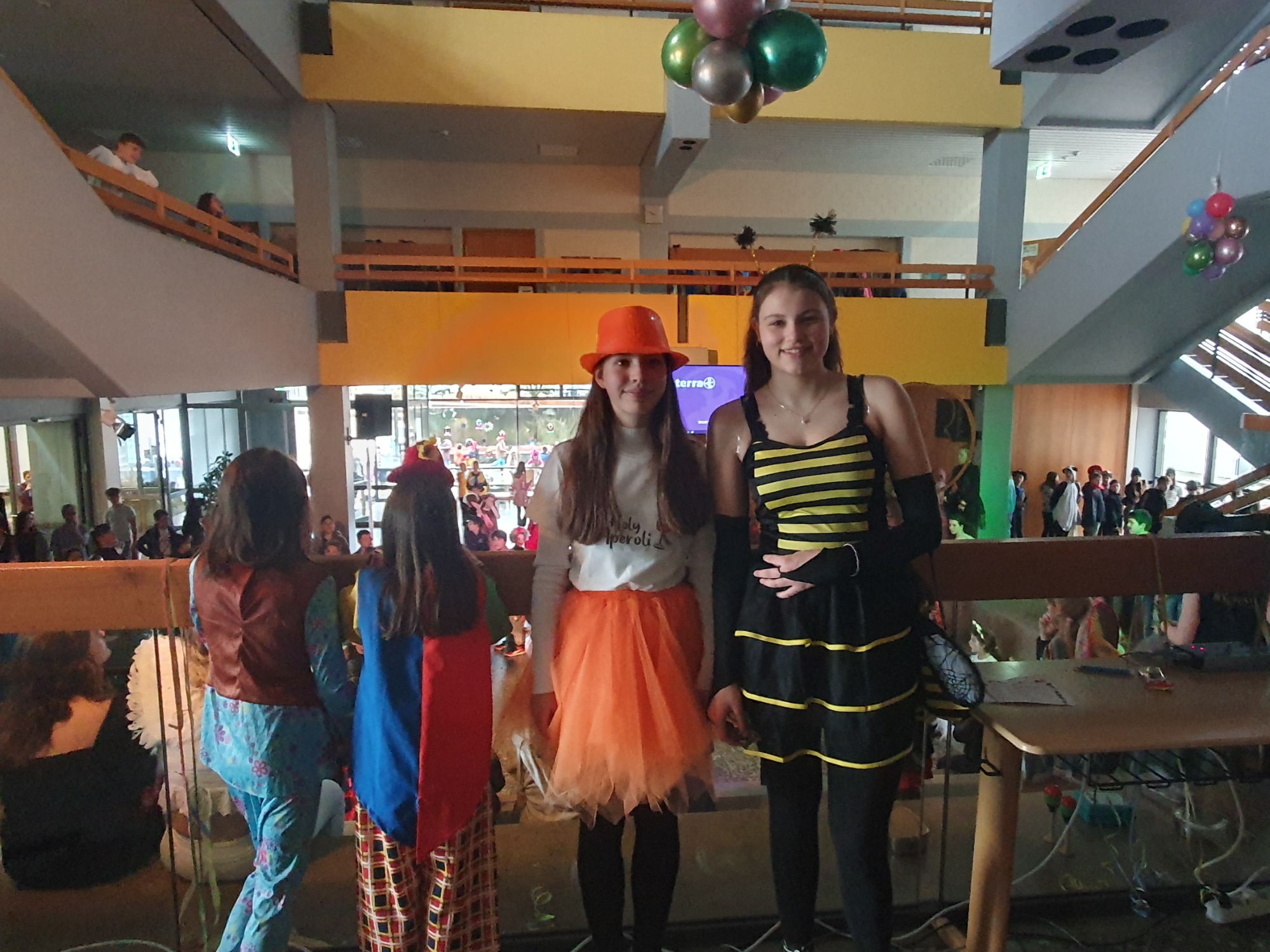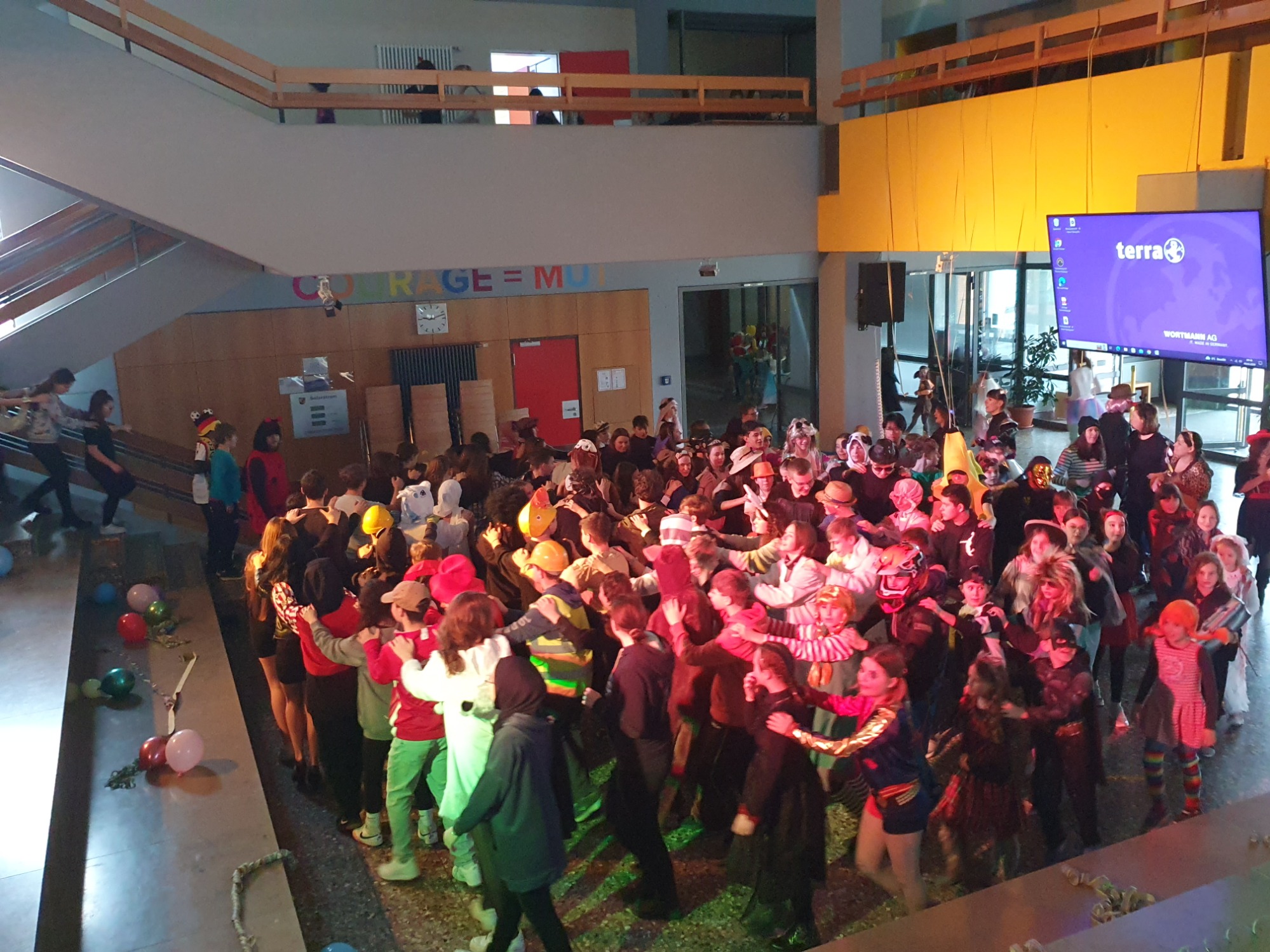 Diese Woche mündete, wie von der SMV geplant, am Freitag in die große Faschingssause der Mittelschule. Der Startschuss fiel um 9 Uhr mit einer großen Polonaise durch das ganze Schulhaus. Anschließend präsentierten alle freiwilligen ihre Kostüme in einer großen Modenschau. Danach begannen die traditionellen Stationen, wie Eierlauf und Dosenwerfen. Jede Klasse konnten in verschiedenen Duellen Punkte sammeln bis zuletzt alle Klassen mit fünf Vertretern beim abschließenden Wettbewerb, Reise nach Jerusalem, antraten. Den großen Klassensieg konnte sich die Klasse M9 sichern, diese wurde mit einer Urkunde ausgezeichnet und einem Gutschein für die Eisdiele belohnt. Auch die kreativsten Kostüme wurden von einer Jury aus Schulleitung und SMV mit Süßigkeiten ausgezeichnet. Die Sause endete mit einem Bonbonregen der Klassensprecher.